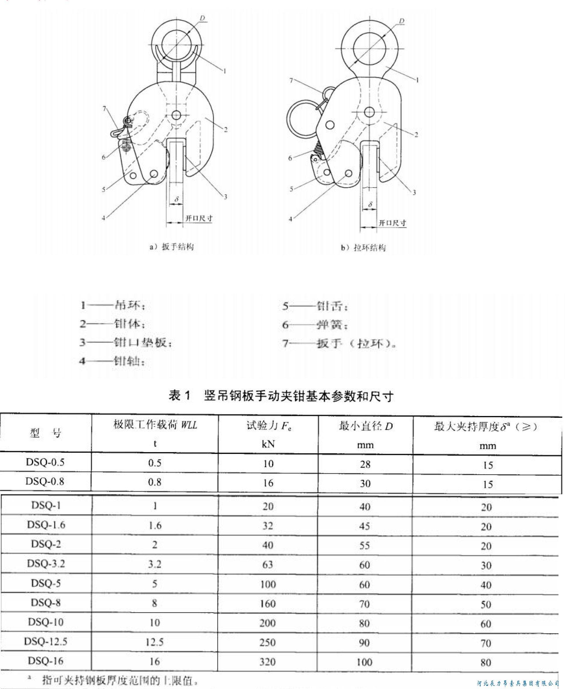 辰力鋼板起重鉗企業標準:起重鉗分類和標記